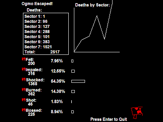 2517 deaths! If you approximate the number of levels to 50 (AFAIK there are 47), that's about 50 deaths per level. Can you imagine dying more than 100 times in one of the harder levels without giving up? It's because there are so many easy levels at the beginning, and because every level accomplished makes it harder to give up. The old "just that one level" thing. Jumper! has a horrible game design, the controls are inaccurate as you know them from all the GameMaker games and yet it's still addicting.